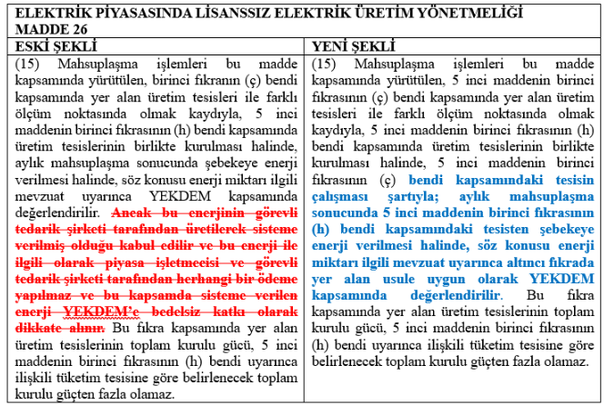 Elektrik Piyasasında Lisanssız Elektrik Üretim Yönetmeliği’nin 26. Maddesinin 15. Fıkrasındaki değişikliğe göre, yenilenebilir enerji kaynaklarından ürettiği enerjinin tamamını kendi tüketimi için kullanan üreticilerin, kendi ihtiyaçları için kuracakları üretim tesisleri ile birlikte farklı ölçüm noktalarında yenilenebilir enerji kaynaklarına dayalı üretim tesisleri kurmaları durumunda, kendi tüketimi için kurulan enerji üretim tesisinin çalışması şartıyla; diğer tesisten kullanım fazlası üretilen enerjinin şebekeye verilmesi halinde, şebekeye verilen tüketim fazlası enerji miktarı aylık mahsuplaşma sonucunda, ilgili mevzuatta yer alan usule uygun olarak YEKDEM kapsamında değerlendirilecektir.